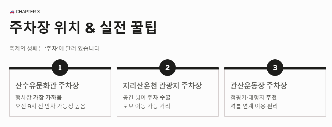 - 산수유문화관 주차장: 행사장과 가장 가깝지만, 오전 9시 전 만차 가능성이 높습니다.