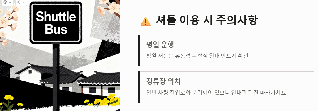 평일에는 셔틀 운영이 유동적일 수 있으니 현장 안내를 꼭 확인하세요.또한 셔틀 정류장은 일반 차량 진입로와 구분되어 있어 안내판을 잘 보셔야 합니다.