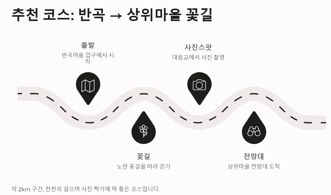 - 추천 코스: 반곡마을에서 상위마을로 이어지는 꽃길 산책