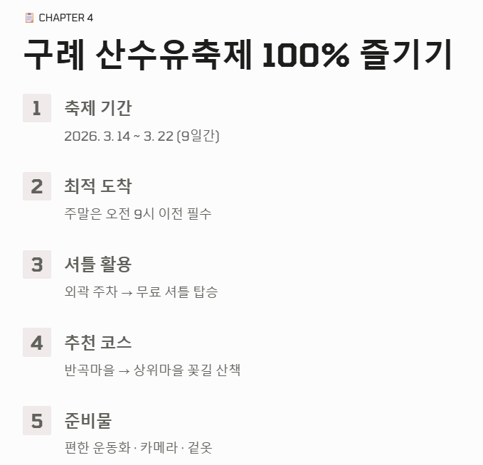 마무리: 구례 산수유축제 100% 즐기기 요약