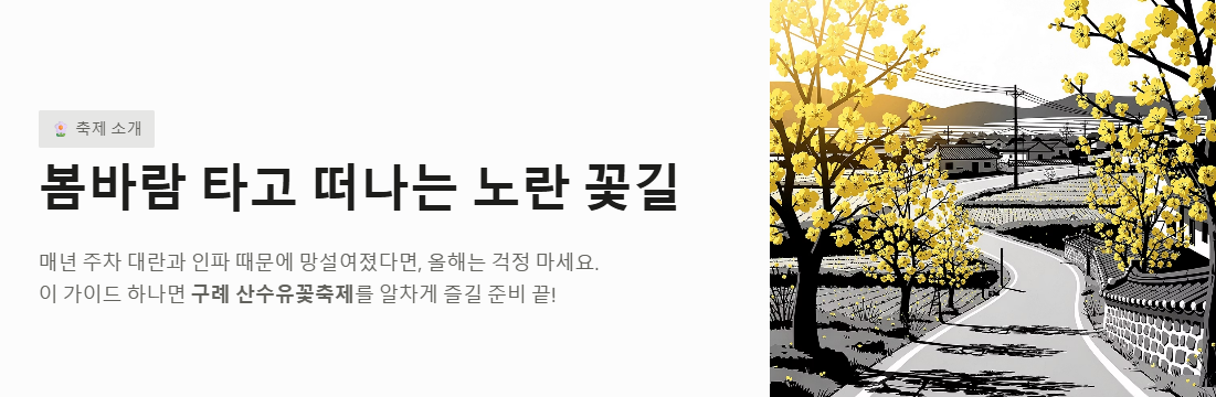 [2026 구례 산수유꽃축제 총정리] 2026년 3월 14일부터 22일까지 열리는 노란 꽃의 향연! 일정부터 셔틀버스, 주차 팁까지 이 글 하나로 완벽하게 준비해 보세요.