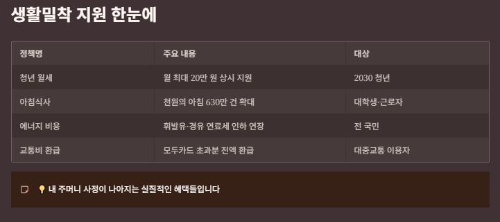 - 교통 및 주거: 모두카드 교통비 무제한 환급 및 청년 월세 지원 상시화.
