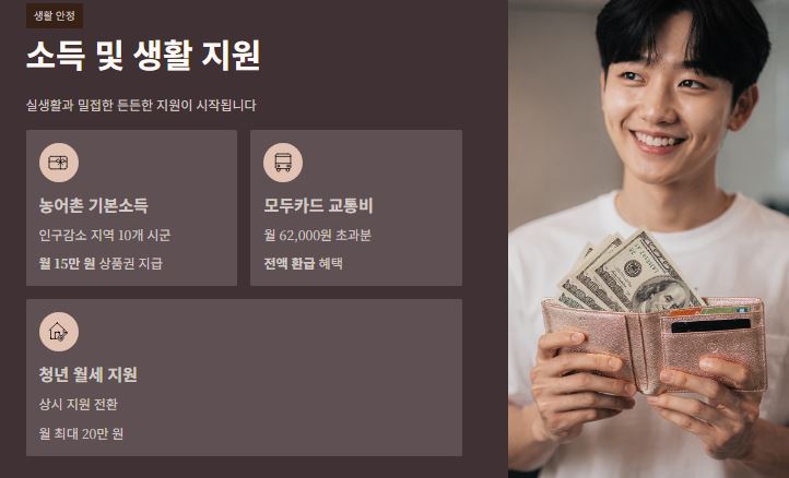 가장 먼저 눈에 띄는 건 실생활과 밀접한 소득 지원 사업들입니다. 특히 지방 소멸을 막기 위한 파격적인 시범 사업과 대중교통 이용객을 위한 혜택이 강화되었습니다.