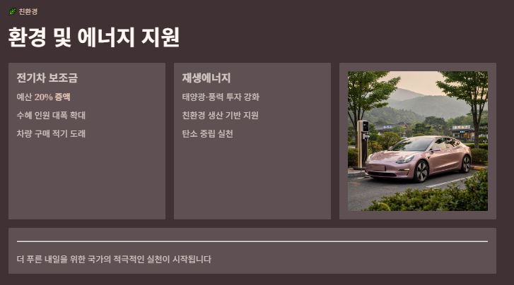 - 환경 친화: 전기차 보조금 예산 20% 증액으로 보급 속도 가속화.