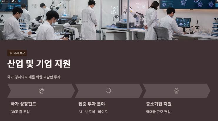 - 산업 육성: 30조 원 규모 국가 성장펀드 조성 및 AI·반도체 집중 지원.