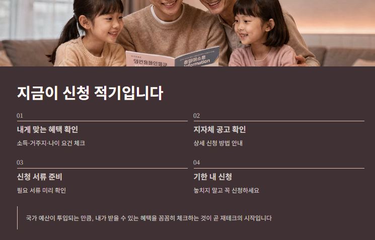 국가 예산이 투입되는 만큼, 내가 받을 수 있는 혜택이 있는지 꼼꼼히 체크하는 것이 곧 재테크의 시작입니다.