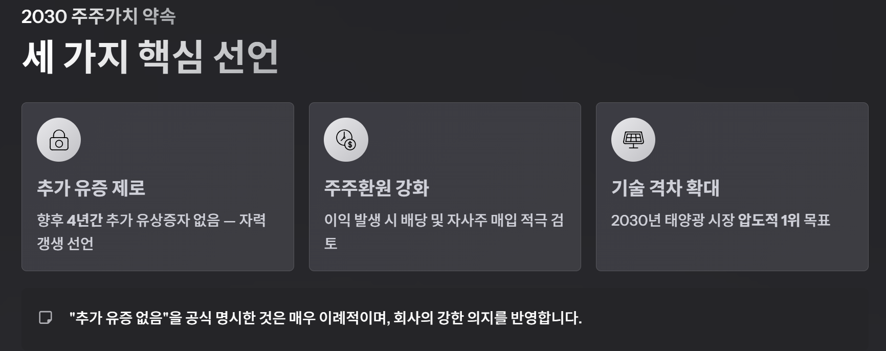 - 2030 선언: 추가 증자 중단 및 주주 환원 확대를 통한 신뢰 회복 시도
