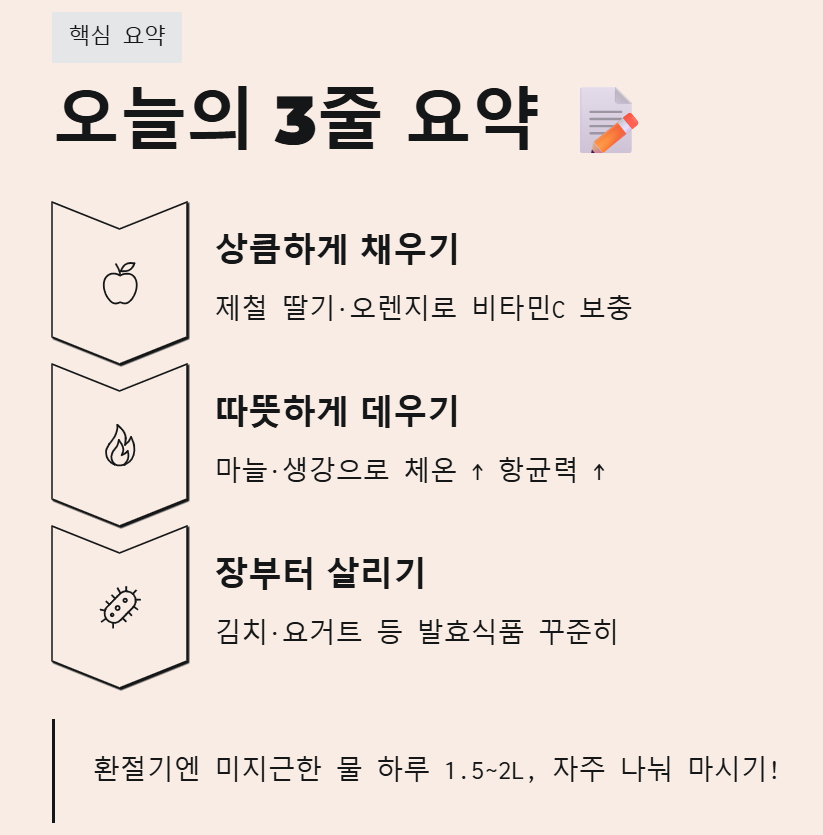 - 상큼하게 채우기: 제철 과일(딸기, 오렌지)로 비타민C 보충하기