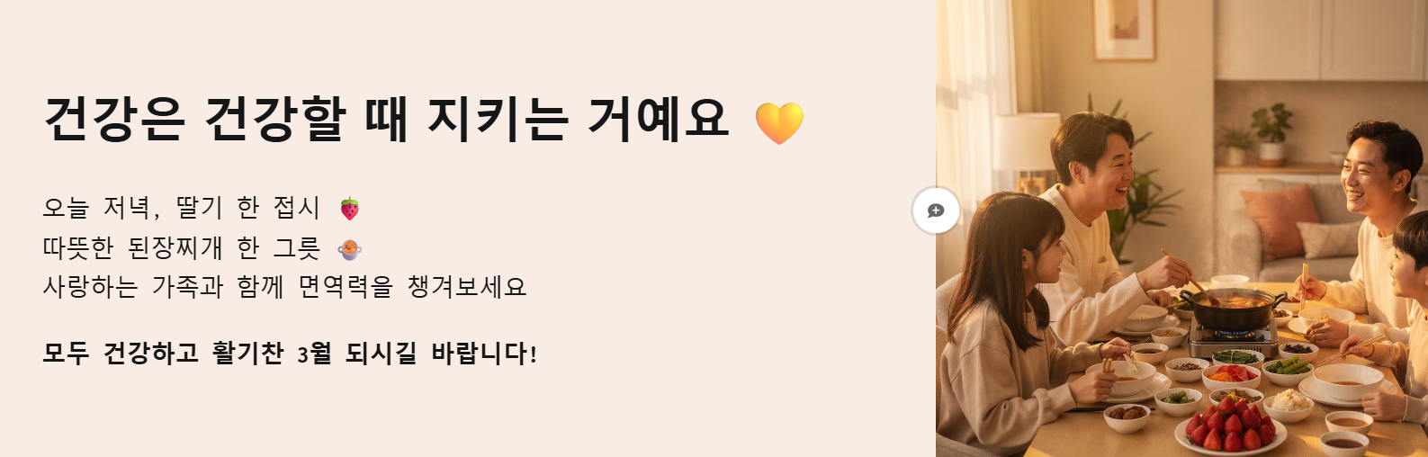 건강은 건강할 때 지키라는 말이 있잖아요? 오늘 저녁에는 상큼한 딸기 한 접시나 따뜻한 된장찌개로 사랑하는 가족들과 함께 건강을 챙겨보시는 건 어떨까요? 여러분 모두 건강하고 활기찬 3월 맞이하시기 바랍니다!