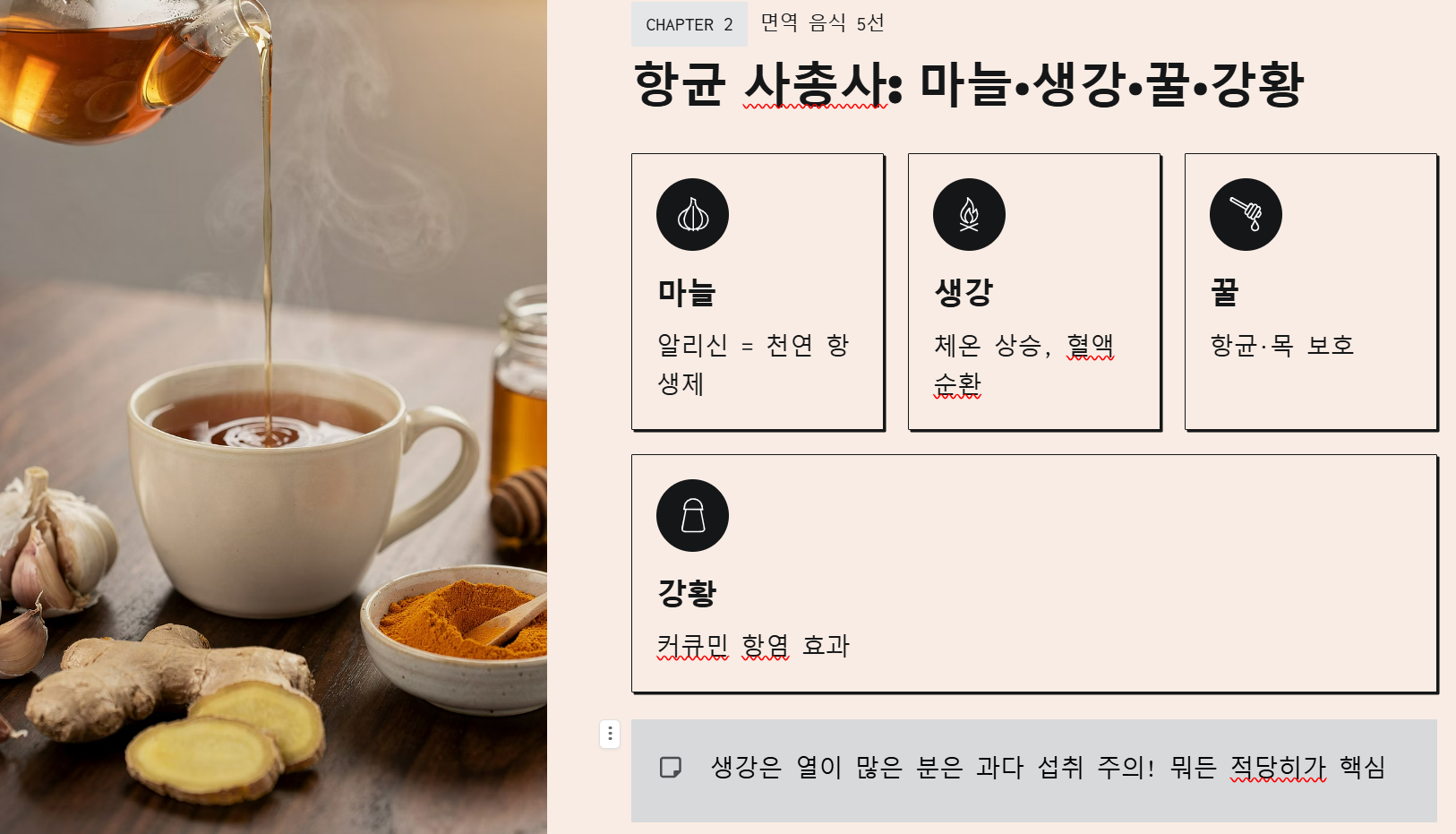 2. 몸을 따뜻하게! 항균 사총사 (마늘·생강·꿀·강황)