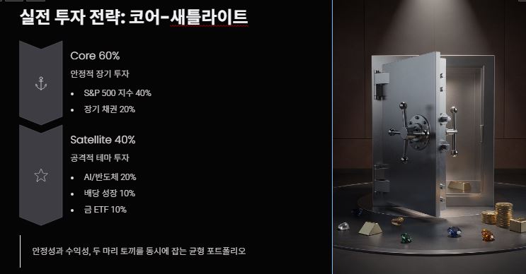 2) Satellite (40%) : AI/반도체 테마 ETF (20%) + 배당 성장 ETF (10%) + 금 ETF (10%)