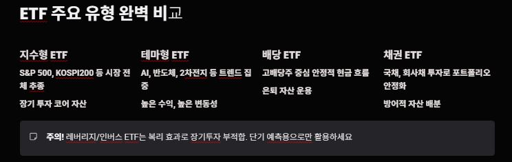 모든 ETF가 똑같지는 않아요. 시장 상황과 자신의 투자 목표에 맞춰 적절한 유형을 선택하는 것이 핵심입니다. 요즘 투자자들의 관심이 집중되는 네 가지 주요 유형을 살펴볼게요.