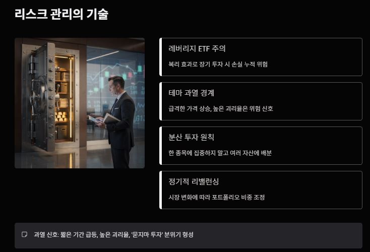 - 리스크 관리: 레버리지/인버스 ETF는 장기 투자에 부적합하며, 시장 과열에 따른 테마형 ETF의 고점 리스크를 경계해야 합니다.