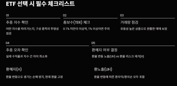 - 필수 체크: 낮은 총보수와 충분한 거래량, 그리고 환헤지 여부를 반드시 확인해야 합니다.
