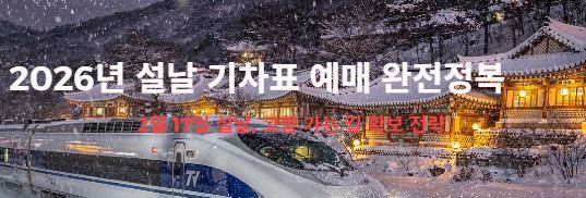 [2026년 설날 기차표 예매 총정리] 2월 17일 설날, 고향 가는 길은 확보하셨나요? KTX와 SRT의 최신 예매 일정부터 역별 추천 시간대까지, 예매 성공을 위한 '치트키'를 지금 바로 확인하세요!안녕하세요! 벌써 2026년 설 연휴가 성큼 다가왔네요. 매년 명절마다 겪는 '기차표 전쟁', 저도 작년에 서버 대기 인원 1만 명을 보고 눈앞이 캄캄했던 기억이 납니다. 하지만 미리 일정만 잘 챙겨도 성공 확률이 200% 올라간다는 사실, 알고 계셨나요? 올해는 여러분 모두 '금손'이 되실 수 있도록, 2026년 설날 KTX/SRT 예매 정보를 완벽하게 정리해 왔습니다. 지금부터 함께 살펴볼까요? 1. 2026년 설날 특별수송 기간 확인 이번 설 연휴는 화요일인 설날(2월 17일)을 중심으로 꽤 길게..